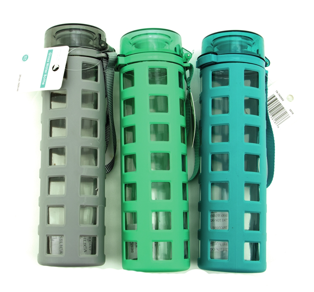 PBA Free Glass Water Bottle with Protective Cover. Assorted Colors Per Case.