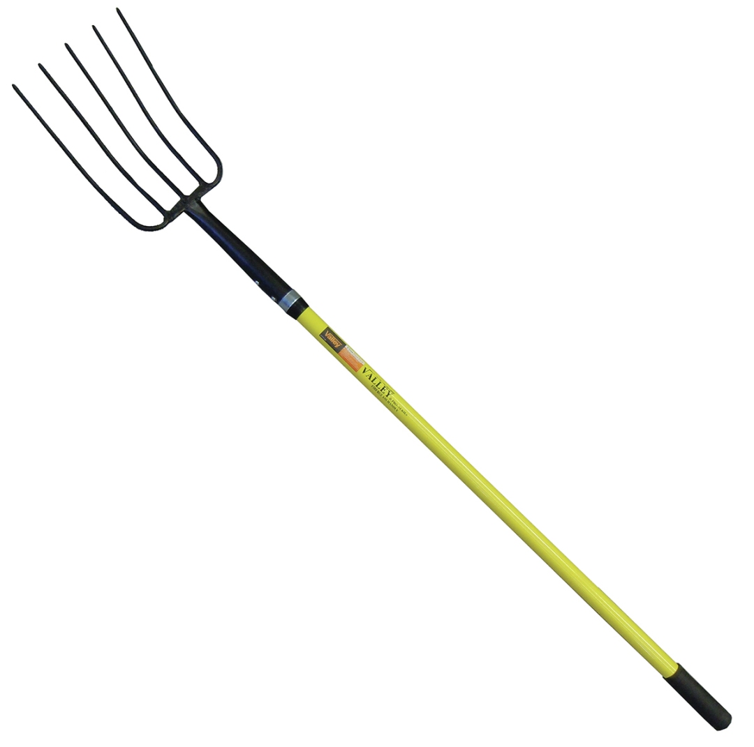 5 Wide spaced oval tines to spread hay, leaves, or other agricultural material | Extra long fiberglass handle for additional reach |