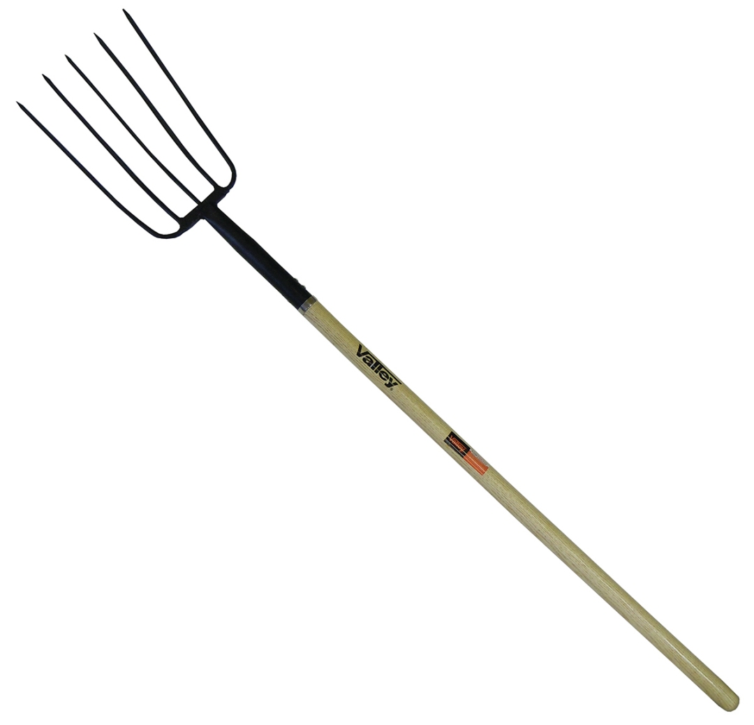 5 Wide spaced oval tines to spread hay, leaves, or other agricultural material | Extra long hardwood handle for additional reach |